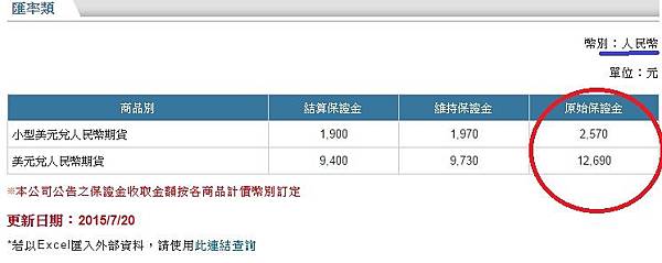 而需要有多少資金才可以操作美元人民幣匯率期貨商品(英文縮寫 RTF RHF) 以下有簡略的介紹 2015.8.19台灣期貨交易所資料