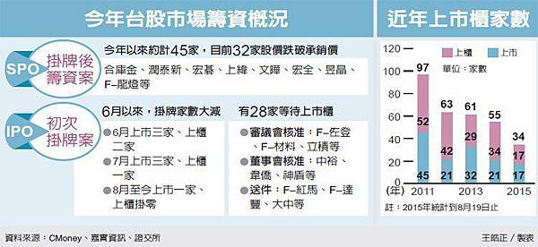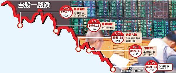 ■ 台灣出口衰退、GDP難保2%,造成股市信心崩盤19日一度摜破8千點。下半年經濟是否有起色,經濟部長鄧振中表示,可以觀察資本財進口、國際油價、廠商新品發表等3項指標觀察;明天經濟部將公佈7月外銷訂單,他表示,樂觀以待。 more...■ 台股19日盤中一度摜破8000點,「破底」止不住,外界直指元凶是證所稅。對此,行政院長毛治國表示,證所稅是可以討論,也值得討論。國民黨籍總統參選人洪秀柱已經提出證所稅修改案,希望立法院快點形成共識。 more...■ 根據美國銀行美林 (Bank of America Merrill Lynch) 週二 (18 日) 發布的最新調查結果,基金經理人正以史上最快速度脫手新興市場資產、大宗商品及能源相關類股,暗示即將走完「投降式拋售 (capitulation)」,這也正是進場撿便宜的時機。 more... (接下頁) ◇美股 ■道瓊工業平均指數收低162.61點或0.93%至17348.73點 ■Nasdaq指數收低40.30點或0.80%至5019.05點 ■S&P 500指數收低17.31點或0.83%至2079.61點 ■費城半導體指數收低5.69點或0.91%至618.32點 ◇亞股 ■台股加權指數收盤下跌155.38點,報8021.84點 ■韓國Kospi指數收低16.88點或0.86%至1939.38點 ■澳洲ASX普通股指數收高70.40點或1.33%至5379.80點 ■上海綜合指數收高45.95點或1.23%至3794.11點 ■香港恆生指數收低307.12點或1.31%至23167.85點