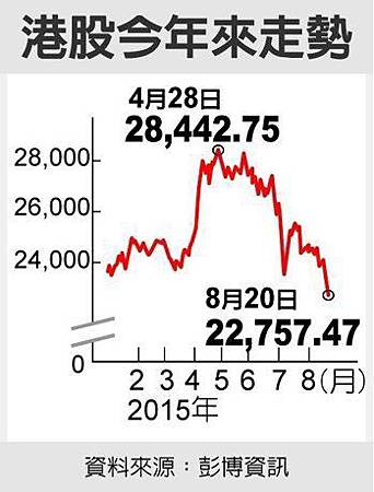 港股弱勢因素,專家認為,涉及新興市場資金外流,更擔心美國升息衝擊,以及大陸經濟趨緩問題,人民幣貶值等後續效應。港股創年內新低點,連7月8日低點22,837點也跌破,恆生指數短短五個交易日連續下挫近千點。
