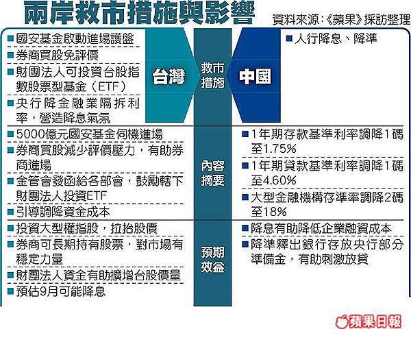 而中國面對經濟前景惡化,股市暴跌,人行昨出手救市,祭出調降基準利率(降息)與存款準備金率(降準)的「雙率雙降」策略,並有助引導人民幣匯率走貶,達成「3率3降」的強力刺激效果。