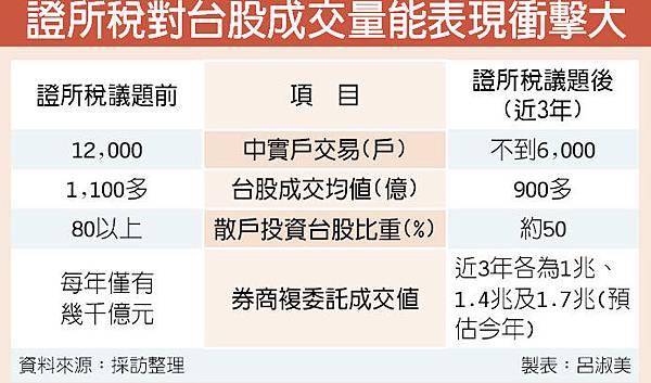 楊朝榮進一步表示,據統計,在證所稅議題出現前,台股日均值約有1,100億元,但在證所稅議題出現後,日均值僅有900多億元,而這900多億元還包括ETF商品多元化,ETF成交值大幅放大,及金管會開放現股當沖,若沒有這些新商品及交易制度開放,台股量能萎縮得更厲害。