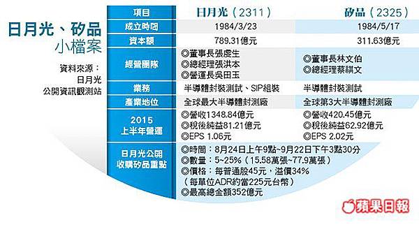 【日月光收購矽品外資是背後最大推手】 日月光自8月24日起公開收購矽品即將在今天截止,短短20個交易日內,就達到5%以上的收購成就條件,背後最大推手非外資莫屬。 根據台灣證券交易所統計,過去3周以來,從外資手中賣出的矽品持股就超過10.4萬張。若根據券商統計,自8月24日以來,外資賣超矽品更超過13.4萬張。 以日月光公告參與矽品台灣公開收購應賣股數的15.65萬張合理推測,雖然矽品散戶股東還在觀望,但日月光收購到的矽品股權,有85%都來自於外資。 《台灣主要報紙頭條要聞》 經濟部昨(21)日公布8月份外銷訂單為350.3億美元、年減8.3%,連續五個月衰退,且是民國98年9月以來最大跌幅,僅資通訊訂單維持成長。經濟部預估,第四季要轉正須很努力,因去年基數太高,9月即使受惠「蘋果光」挹注接單,跌幅仍可能達1成,全年極可能負成長。 ■ 工商時報 外銷訂單 8月連五衰 9月不看好 歐美股走強亞股盼拉一把 習近平今訪美可望簽署BIT ■ 經濟日報 央行助跌台幣貶近3角 外銷訂單連五黑全年恐衰退 鴻海買夏普面板找蘋果入股 《重要新聞》 ■財政部長張盛和在立法院表示,證所稅三讀延至11月對股市影響應該還好,國外股市與國內情勢都算穩定,他不清楚台股下跌是否與股市禁空令太早解除有關,對於救經濟的有效方法,可以靠寬鬆貨幣與擴張性財政政策雙管齊下。 more... ■高盛 (Goldman Sachs) 週日 (20 日) 預估,歐洲央行 (ECB) 將擴大量化寬鬆 (QE)貨幣刺激措施,來達成通貨膨脹目標,使得歐元最多恐怕會進一步貶值 10 美分。 more... ■中國大陸電子商務龍頭阿里巴巴 (BABA-US) 去年 (2014) 9 月在紐約證交所風光上市,但萬人簇擁的慶祝行情卻持續不了太久。研究機構 Oppenheimer 指出,阿里巴巴業務核心的商品交易總額降低,因此調降 2016 與 2017 財年的每股盈餘 (EPS) 預估。 more... ◇美股 ■道瓊工業平均指數收高125.61點或0.77%至16510.19點 ■Nasdaq指數收高1.72點或0.04%至4828.95點 ■S&P 500指數收高8.94點或0.46%至1966.97點 ■費城半導體指數收低2.02點或0.33%至608.73點 ◇亞股 ■日經225指數18日收跌362.006點或1.96%,報18070.21點 ■韓國Kospi指數21日收跌31.27點或1.57%,報1964.68點 ■澳洲S&P/ASX 200指數21日收跌104.26點或2.02%,報5066.25點 ■上證綜合指數21日收漲58.62點或1.89%,報3156.54點 ■香港恆生指數21日收跌166.73點或0.76%,報21754.10點 資料來源:鉅亨網 udn