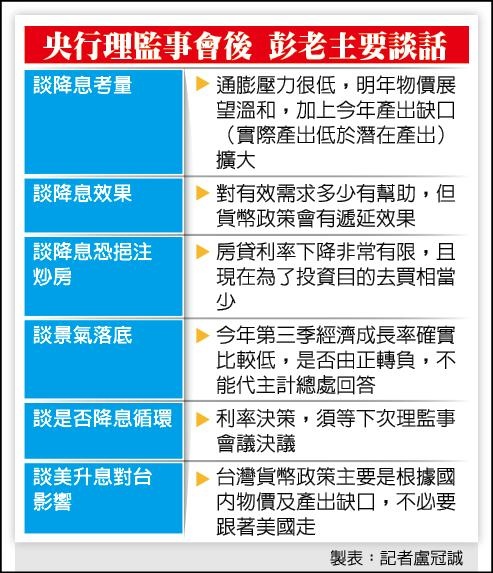 對於降息是否會挹注炒房風氣,央行總裁彭淮南表示,房貸利率下降非常有限,且現在為了投資目的去買房的相當少。