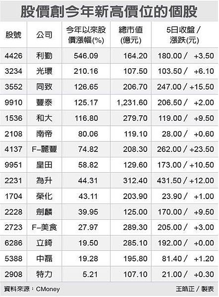 另外,雖然近期市場操作偏向保守,但部分強勢股因具備題材,股價強勢領漲,投資人仍可留意。 根據顯示,至昨天收盤為止,共計有15個上市櫃個股,股價創下今年新高價位、且市值超過百億元;其中,電子僅三檔,分布在IC設計、網通等,傳產股則有12檔,包括汽車零組件、紡織、觀光、百貨等次產業。 觀察這些個股今年以來的股價表現,以利勤大漲546.09%最為耀眼,光環上漲210.16%、同致上漲126.65%;另外,豐泰、和大等,今年以來漲幅也都超過一倍。