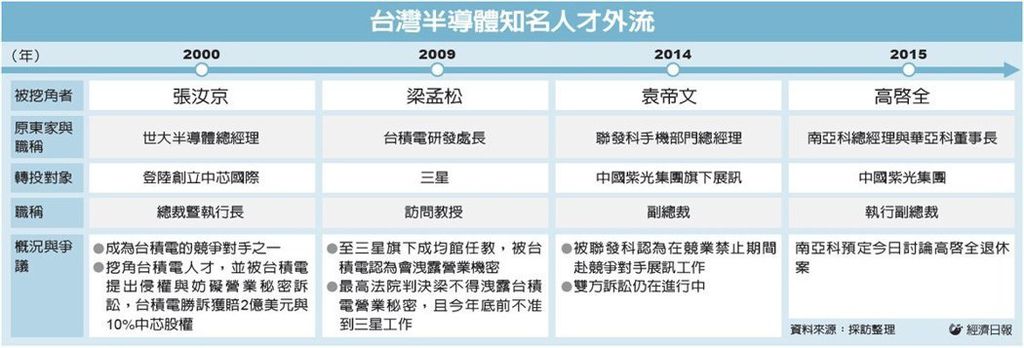 期貨小靜來報新聞囉! 【打開出走史…半導體四將引發大旋風】 半導體業是台灣電子業的獲利核心,人才也成為各界覬覦的對象,經常傳出挖角,或是妨礙營業秘密、侵權等訴訟,歷來並以張汝京、梁孟松、袁帝文及高啟全等人的轉檯,最受矚目。 翻開台灣重量級半導體人才登陸事件,最早當推中芯國際創辦人張汝京。2000年間,因為台積電併購他創辦的世大半導體,他選擇轉戰到中國創立中芯國際,在當地複製台灣的晶圓代工模式,並吸引一波台灣人才登陸潮。 梁孟松出身台積電,因2009年自台積電研發處長離職後,在禁止競業期間被發現赴三星旗下成均館任教,被台積電視為洩露營業秘密給三星。由於三星在14奈米製程進度追上台積電,而且台積電的蘋果訂單甚至因此被分食,被外界解讀為是因為梁孟松的投靠,才讓三星縮短學習曲線。 聯發科前手機部門主管袁帝文,2012年離開老東家後,被聯發科認為在禁止競業期間,轉赴頭號競爭對手之一、也就是中國大陸紫光集團旗下手機晶片廠展訊任職,憤而提出訴訟。袁帝文在禁止競業期滿後,正式接下展訊高級副總裁職務。 如今南亞科總經理高啟全確定異動,也轉投中國大陸紫光集團。 資料來源:udn