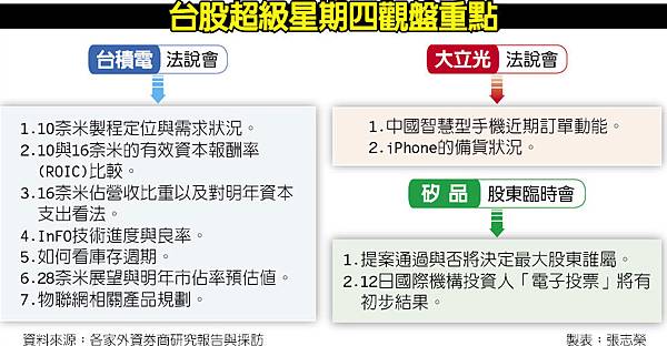 本周15日將是台股「超級星期四」,除牽動半導體庫存水位調整最新進度的台積電,以及中國智慧型手機需求狀況的大立光,將同步舉行法說會外,矽品也將舉行股東臨時會,決議增資以及與鴻海策略聯盟雙提案,預料股市將「停、看、聽」。 針對台積電法說會,根據港商德意志證券半導體分析師周立中的預估,第三季每股獲利為2.88元、略高於外資圈預估平均值的2.85元,考量到庫存調整時間延長至第四季,第四季營收將較第三季下滑4%,備庫存效應將從第四季下半季開始展開。