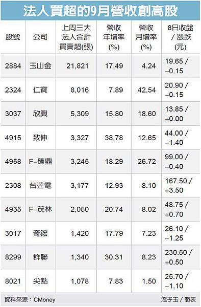 9月營收陸續公布,業績創新高、且法人積極買超個股,多屬PC組裝、蘋概股、太陽能、光通訊等四大族群,相關個股預期將成為近期台股多頭聚焦的重心。 大展投顧策略長李政諺表示,蘋概股一直是台股多方焦點,法人自第2季以來,就不斷積極買超,尤其是新功能、新應用供應鏈,像是壓力觸控、機殼等;不過,也因為許多股價位階已高的蘋概股,同時出現利多鈍化的走勢,因此,緊盯法人買超股、並區間操作是較佳的策略。