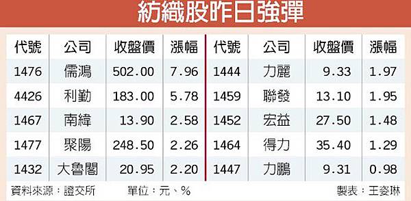 歐美股市拉回整理,影響台股昨(21)日開高走低,終場下跌0.51%收8,609點,惟紡織類股受惠NIKE展望佳與紡織展兩大利多,股王儒鴻(1476)7.96%收502元,高價股利勤(4426)、聚陽(1477)也大漲5.78%、2.26%,帶動紡織指數上漲1.81%,領先大盤率先突破半年線,占大盤交比重也擴增至5.61%。