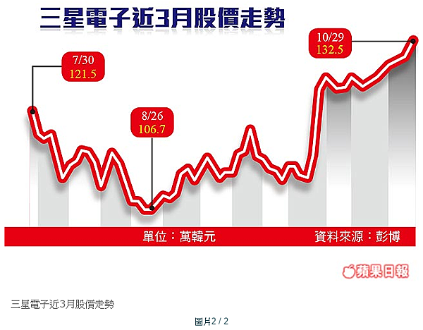 三星股價昨盤中一度大漲6.4%至近半年新高139.2萬韓元,收盤漲1.3%,表現較韓股大盤KOSPI指數強勢。