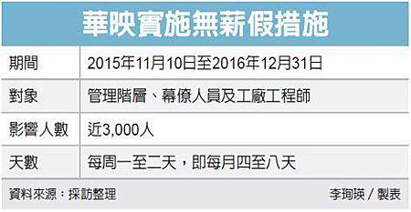 面板業提前過冬,華映總經理林盛昌昨(5)日證實,在不裁員下,下周二(10日)起,間接人員實施每周一至二天、長達14個月的無薪假,估計影響近3,000人,直接人員則調整輪班,減少工時。華映開了面板業實施無薪假的第一槍。 因應這波景氣寒冬,華映上周宣布出售八德的4代廠予凌巨,並關閉龍潭的一座4.5代廠,同步資遺525名員工。其中,包括八德4代線的華映員工,將依勞基法資遣結算,終止雇用關係,再由凌巨公司重新聘用。以及龍潭及楊梅廠,年底的例行性人力檢討。 林盛昌強調,他也會與員工一樣,雖然不放無薪假,但間接減薪,共體時艱。 資料來源:UDN