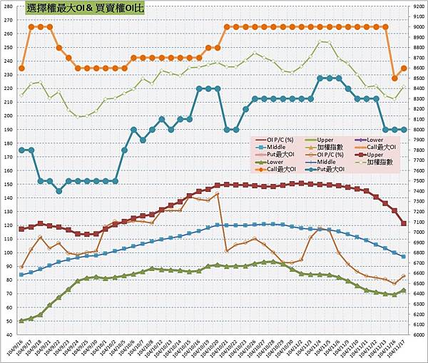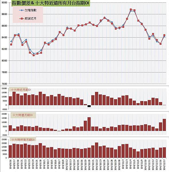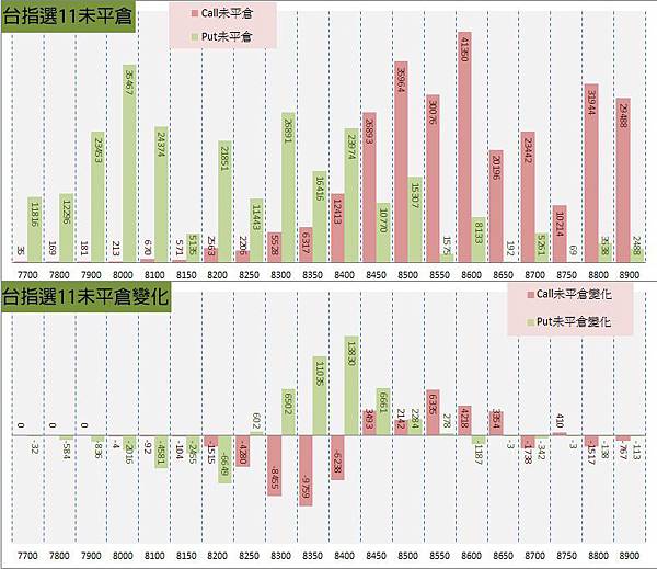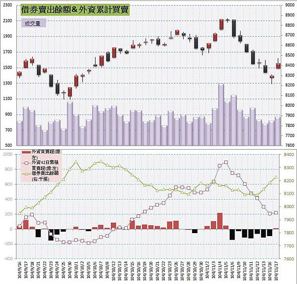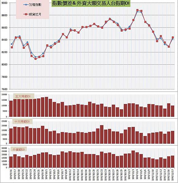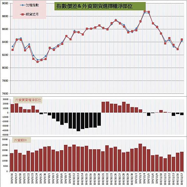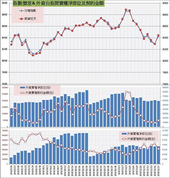 【1117觀盤重點回顧】 1. 國際股市:道瓊工業指數終場在藍籌股蘋果以及石油類股艾克森美孚上揚帶動下,上漲超過 236 點作收,美股三大指數收漲,道瓊指數 上漲 236.84 點,收在 17482.08點,標普 500 指數上漲 30.15 點,收在 2053.19點。那斯達克指數上漲 56.73 點,收在 4984.62 點。 2. 期貨選擇權:11月買權未平倉量最大量在履約價8600點的4.1萬口,賣權未平倉量最大量在履約價8000點的3.5萬口。 3. 加權指數:台股盤中強彈,強勢股恆強,指數今日上漲124.02點,終場台股以8419.42點作收,量能858億,為量縮大漲的格局。 (1)技術面:現貨指數目前站上短期均線位置,不過仍為空方勢,操作上建議在持有現股的同時,買進價外兩檔履約價的賣權避險,以保護 現股的部位。 (2)籌碼面:[1]現貨部份三大法人今日合計買超21億元,其中外資買超13億。[2]期貨部份外資今日淨部位多單18651口,今日增加淨多單 994口,外資淨部位多單小增,將增加指數反彈力道。