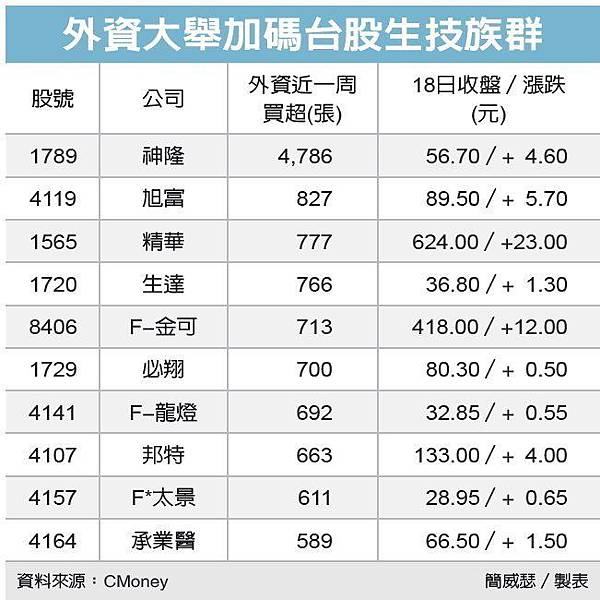 過去一周外資砸下2.4億元、大手筆加碼浩鼎500張持股,同時轉進指標股精華、F-金可、神隆,甚至也大買旭富、生達、必翔等小型股,頗有看好生技族群未來性意味。另外,生技族群是櫃買中心重點扶植產業,外資青睞度提高象徵櫃買將台灣生技業推向國際有成。