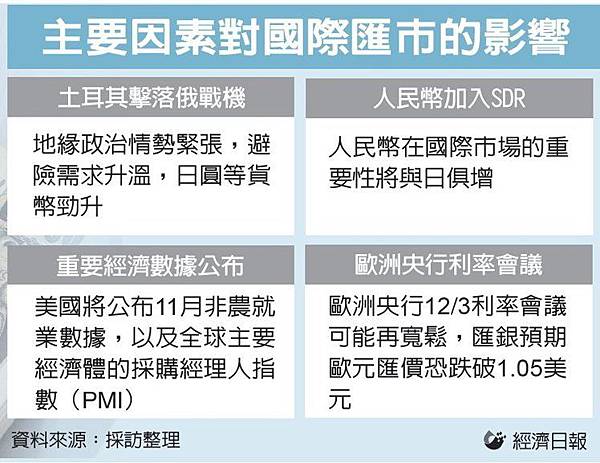本周不只要關注剛過完感恩節的土耳其,是否仍會被俄羅斯視為餐桌佳餚,經濟面兩大焦點分別是美國11月非農就業數據,以及全球主要經濟體的採購經理人指數(PMI)。 另外,國際貨幣基金組織(IMF)將於11月30日召開會議,討論人民幣是否應被納入SDR。匯銀主管說,在全球籠罩恐怖攻擊陰霾,急覓資金避風港時,人民幣若加入SDR,顯示在國際的地位顯著提升,但這並不代表人民幣會成為全球熱烈擁抱的避險貨幣。