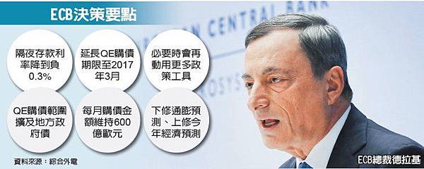 歐洲央行(ECB)為提振疲弱通膨與低迷經濟,周四再度祭出刺激措施,包括將存款利率從負0.2%進一步壓低至負0.3%,把量化寬鬆購債措施實行時間延長至少半年。