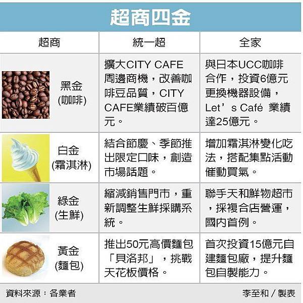 超商霜淇淋業績下滑,咖啡卻帶動麵包、三明治、甜點等烘焙產品銷售同步成長。 本報系資料庫 分享超商雙金失色,白金(霜淇淋)退燒,綠金(生鮮)拓展不易。霜淇淋銷售回歸常態,爆發性成長不再;7-ELEVEN調整生鮮經營模式,將原本約1,000生鮮店縮減為300家,將重建產銷系統;全家則牽手天和鮮物,是國內超商與超市合作先例。