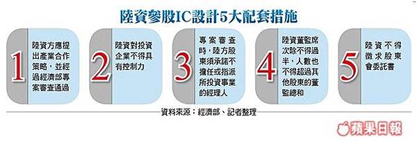 【陸資入股台IC/聯發科:樂觀其成】 經濟部擬開放陸資投資我IC設計業,但須符合五大配套措施,聯發科昨天表示,贊成開放投資的論點始終不變,對經濟部的方向樂觀其成。 台灣IC製造業的產值遠大於IC設計,既然IC製造已有條件開放,IC設計業也應該在類似標準下,有條件比照開放陸資。 台積電、聯發科都有一半以上的股東是外資,因為投資、營運和智慧財產權(IP)保護,是完全三個不同面向的公司治理,站在產業觀點,「開放一定比封閉好」。