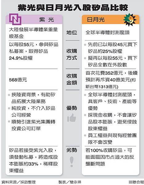 【日月光抗紫光現金搶矽品100%股權】 封測龍頭大廠日月光力拒大陸紫光集團入股矽品,同樣也以每股五十五元,向矽品董事會提議現金收購矽品百分之百股權,估計總收購金額高達四十億美元(約新台幣一千三百十三億元)。 矽品經營層對日月光的收購股權案一直存有敵意,因而未理性審慎思考各種與日月光合作的可能性。他坦承,若矽品同意,得撤銷與紫光簽訂的入股協議,同時下市;若不同意,日月光會繼續保持正向樂觀看待。
