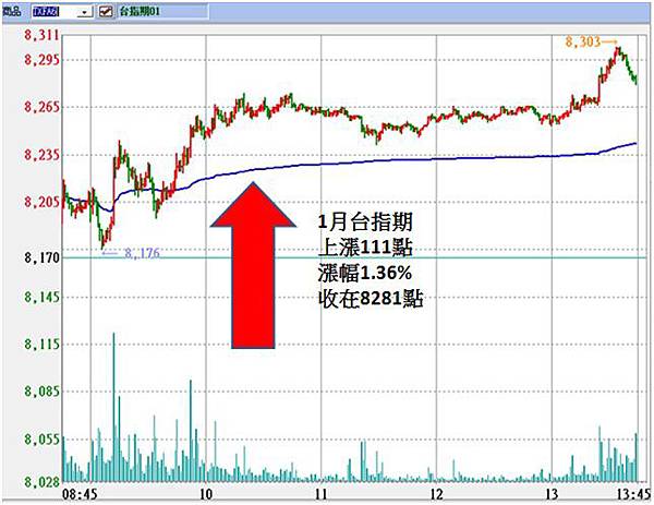 【強漲111點台指期淺嚐8300】 美國確定升息、美股衝高收盤,台指期開盤即由金融期指帶領上揚,盤中屢見拉抬買盤推升,今日為新合約開始,多頭企圖營造攻堅8,300點氣勢,尾盤最高一度攻至8303點;台指期終場收在8281點,上漲111點,成交量144,407口,期現貨逆價差39點。 台指期今日在9點12分多頭拉抬下,逆價差有收斂情況,今日盤中多數時間逆價差維持在10~15點區間,幾筆上千口買盤積極往上攻堅,帶動台指期緩步上揚。目前外資的台指期淨多單約1.8萬多口。