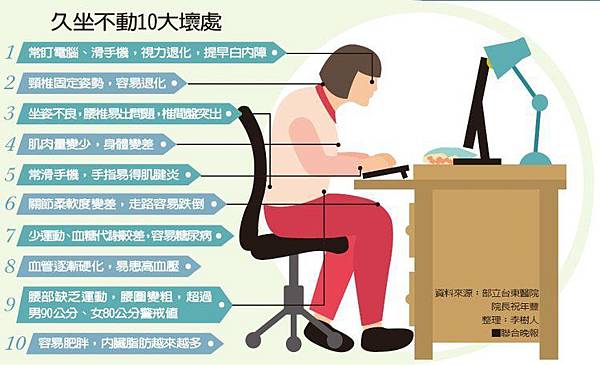 期貨小靜分享健康新聞~ 85.3%受訪者下班後休閒娛樂為靜態活動,例如看電視,或使用3C產品,幾乎都得坐著。蔡克嵩警告,「坐」越久,腰圍越粗、內臟脂肪越多,影響血糖、三酸甘油酯濃度,心血管疾病死亡率風險隨之增加。 下班後懶洋洋坐在沙發上看連續劇、打電動,看似紓壓,但美國研究發現,下班後看電視超過四小時者,代謝症候群罹患率達35%。 如何減少久坐,減少腹部脂肪囤積?祝年豐建議上班族,養成站著講電話的習慣,辦公時每小時起身活動三至五分鐘;選擇小容量的杯子,才能經常起身倒水、上廁所。 此外,工作時,應該少坐電梯,多爬樓梯。搭車上下班,不要急著搶位子,最好多站、少坐。搭車回家時,建議提早一站下車,讓自己有機會多走走路。 資料來源:UDN