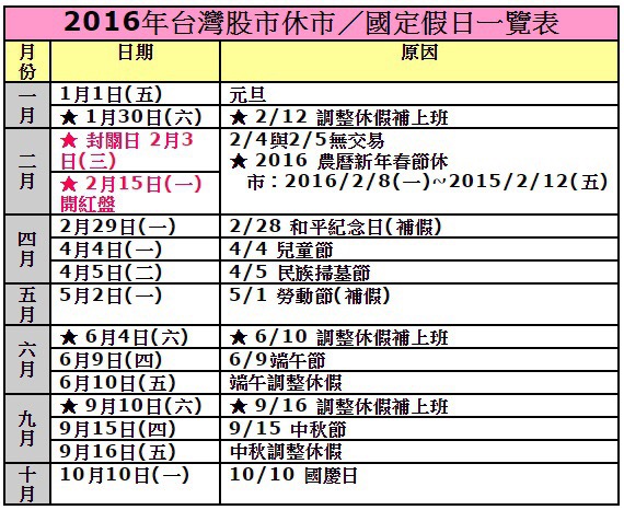 2016台灣股市休市日一覽表