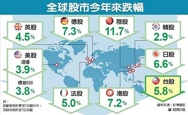 《台灣主要報紙頭條要聞》 ■ 中國時報 恐襲利比亞警校 65死逾百傷 熔斷機制害的!陸股13分鐘打烊 新年不快樂台股4天跌486點跌破10年線金管會救市:今起融券保證金提高 ■ 工商時報 陸股熔斷機制急喊停 索羅斯:恐爆金融危機 黑天鵝變黑熊亞股恐演完美風暴 ■ 經濟日報 彭淮南:台不會有金融危機 金管會兩招救市 美股跌幅聞聲收斂 《重要新聞》 ■人行再砍中間價0.5%!創8月以來最大貶幅離岸貶破6.74more... ■驚!中國12月份外匯存底暴減1080億美元創史上最大減幅more... ◇美股 ■道瓊工業平均指數收低392.41點或2.32%至16514.10點 ■Nasdaq指數收低146.33點或3.03%至4689.43點 ■S&P 500指數收低47.16點或2.37%至1943.10點 ■費城半導體指數收低20.95點或3.32%至610.25點 ◇亞股 ■日經225指數收盤下跌423.98點或2.33%,報17767.34點;開盤18139.77點。 ■韓國Kospi指數收盤下跌21.10點或1.1%,報1904.33點;開盤1915.71點。 ■上證指數跌7.32%,報3115點,深證成指挫8.35%,收10745點。 ■恒指跌647.47點、報20333.34點、跌幅3.09%。 資料來源:鉅亨網 udn