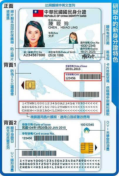 內政部規劃二○一八年全面換發晶片國民身分證,上周在國發會網站公布規劃方案。內政部戶政司長張琬宜昨說,目前晶片身分證(eID)研議採國際民航組織(International Civil Aviation Organization,ICAO)規格,外觀記載中英文姓名、西元出生年月日及效期,晶片內存取父母、配偶姓名、戶籍地及役別等資料,藍白底色,還有簽名檔,但現仍在聽取民意階段,尚未定案。