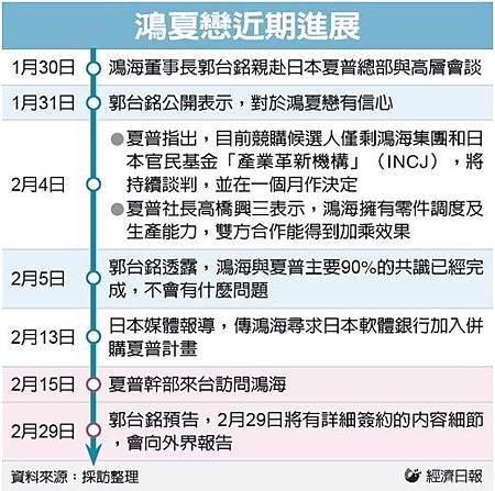 華爾街日報2月初曾披露,夏普幹部預定2月15日來台,昨天在鴻海土城總部門口,也被電子媒體拍攝到疑似夏普幹部一行人進入鴻海總部大樓。 郭台銘日前透露,29日將有詳細簽約的內容細節,市場解讀鴻夏戀將在當天有最終答案。業界人士認為,若鴻海與夏普在2月29日正式簽約,夏普社長高橋興三和郭台銘會再和媒體見面,向外界說明未來發展等細節。 資料來源:udn |