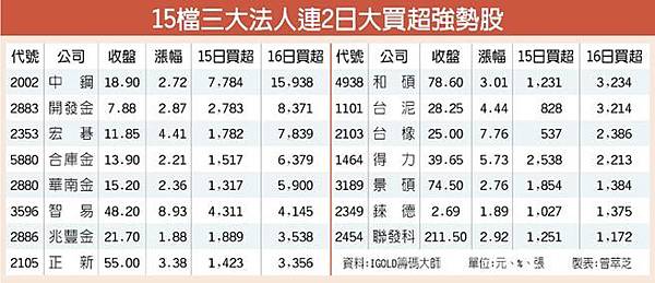 國際市場輪流反彈,歐股強漲帶動亞股昨(16)日續揚,台股大漲145點收在8,212點,中鋼(2002)、開發金(2883)等15檔,吸引法人連2日大買超,多頭行情急行軍。
