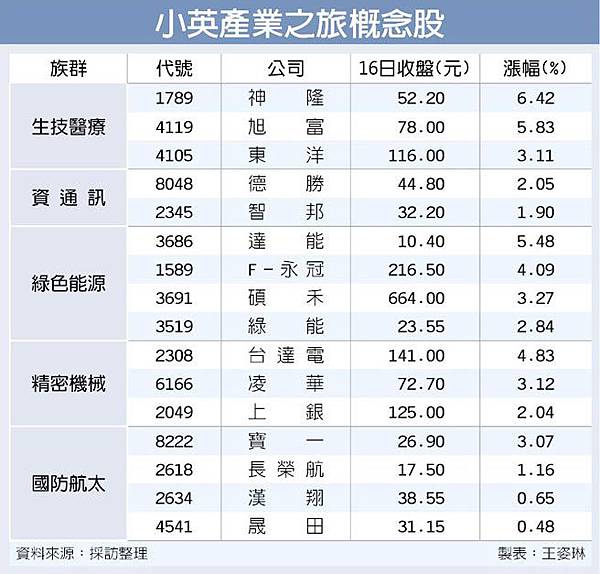 小英產業之旅概念股 紅了總統當選人蔡英文將啟動產業參訪之旅,產業涵蓋生技醫療、半導體、精密機械、綠色能源、國防航太、資通訊等面向,帶動相關概念股股價顏色表態「紅了」。