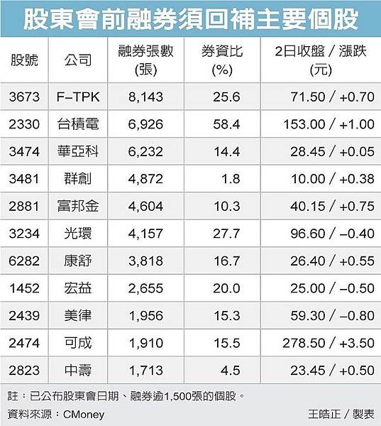 期貨營業員~郭靜宜(10萬張融券將強制回補//台股三軋爆千億元大量) 期貨小靜來報新聞囉! 【10萬張融券將強制回補】 上市櫃公司接續公布今年股東常會日期,台股也將邁入融券回補高峰,F-TPK、台積電、華亞科、富邦金等逾百檔的融券超過10萬張,未來將強制回補,高融券個股正伺機啟動軋空走勢。 現階段僅調整為股東臨時會融券不必強制回補,今年股東常會、除權息仍需回補。