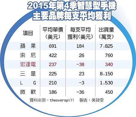 經濟規模不足,宏達電每賣一支手機就慘賠超過1,200元(新台幣,約38美元)。根據科技網站theoverspill推算,宏達電去年第4季平均出貨單價237美元,僅次於蘋果、索尼,比三星高出12美元,然而宏達電出貨量只有340萬支、僅及三星的4%,各項成本攤提難以下滑,導致每賣出一支手機,宏達電就會蒙受38美元的虧損。 針對上述報導,宏達電方面不表示意見。
