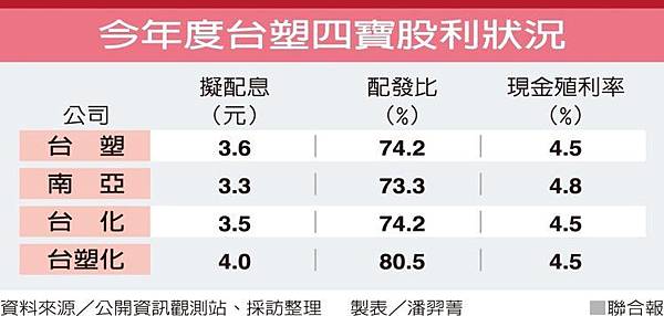 期貨小靜(台塑四寶股利今年破千億元大關//清明變盤說:節前上節後下??) 期貨小靜來報新聞囉! 【台塑四寶股利今年破千億元大關】 台塑四寶今年配息全出爐,南亞董事會昨天通過擬配息3.3元,為2011年度以來新高,若按照南亞收盤價67.5元計算,現金殖利率約4.88%,合計四寶今年總發放股利高達1077.04億元,破千億元大關。 台塑四寶今年股利發放普遍比去年高,台塑擬配息3.6元,南亞為3.3元以及台化的3.5元,上述三家的配發比率約73%~74%,身為去年四寶獲利王的台塑化,今年擬配息4元,絕對值與配發比例均為最高。
