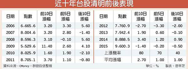 【清明變盤說:節前上節後下??】 清明節即將在4月5日來臨,據統計,清明節前5日及10日上漲機率分別高達80%及70%,但後10日平均上漲機率僅有40%。