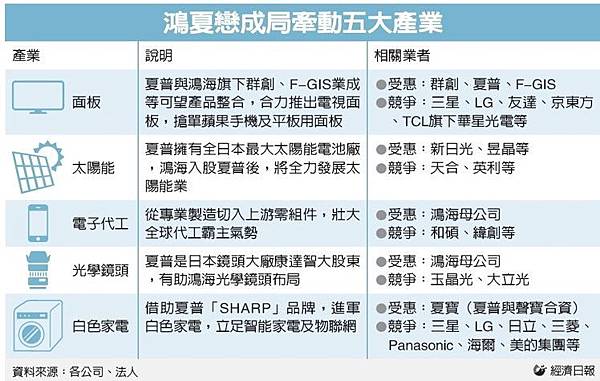 鴻夏戀成局,未來全球電子代工霸主鴻海攜手日本百年企業夏普,將牽動全球面板、太陽能、電子代工、光學鏡頭及白色家電等五大產業的競爭版圖。