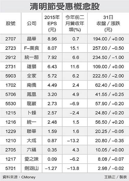 期貨小靜來報新聞囉! 【清明連假到四族群受惠】 清明節連假明(2日)日展開,連休四天,料將掀起新一波內需消費熱潮,食品、百貨、零售、觀光等四大受惠族群,將有機會隨消費需求量的增加而帶動業績成長,躍居台股盤面焦點。 今年清明節和兒童節形成有四天連續假期,祭祀、食品、百貨與零售等類股,可望同步受惠。旅遊、觀光等相關族群,也將在連假題材加持下,成為市場買盤關注的焦點。 連假效應更將掀起新一波消費熱潮,包括統一、F-美食、晶華、雄獅等百貨、食品、觀光等類股將是受惠股,第2季表現值得期待。