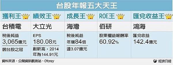 【年報五天王台積蟬聯獲利王】 2015年上市櫃公司財報全數出爐,台股五天王出列,台積電、大立光、鴻海、海灣、佰研,分別奪得獲利王、績效王、匯兌收益王、成長王、ROE(股東權益報酬率)王的殊榮。