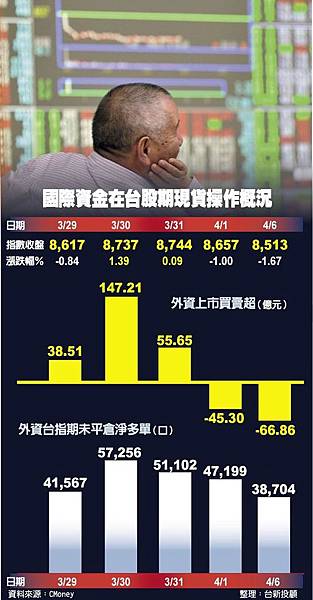 期貨~郭靜宜(外資翻臉資金擬捨台轉陸//庫存爆滿鐵礦砂價格有壓) 期貨小靜來報新聞囉! 【外資翻臉資金擬捨台轉陸】 台股期現,做空達200億 台指期透過134億元平倉7,904口淨多單,合計在期現貨變現200億元,外資圈認為參考意義不大,整體投資氛圍有轉向。 3大利空,台股重挫 台股昨天盤中跌破8,500點的主要原因包括下列3項:一、歐美股市重挫致使補跌;二、國安基金恐不再護盤;三、大立光3月營收低於預期;蘋果供應鏈成為領跌指標。 國際資金已連續賣超台股兩個交易日、合計達112億元,顯示調節賣壓力道已開始轉強;可有轉向避險或低基期的標的或市場,如陸股的味道。