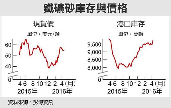 【庫存爆滿鐵礦砂價格有壓】 隨著供應增加,中國各大港口的鐵礦砂庫存量或許近期就會突破1億噸,為一年來首見,令價格承壓。 中國港口的鐵礦砂庫存上周攀升2.3%至9,700萬噸,達2015年4月以來最高。MineLife公司和Westpac銀行表示,鐵礦砂庫存已經連三季擴張後,近幾個月內可能突破1億噸。