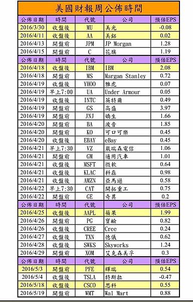 1. 美國企業財報季開鑼 首先是美國鋁業11日盤後將公布第1季財報,為美企財報季揭開序幕。 2. 全球財金首長開會 全球財金首長15日起將在華府參加國際貨幣基金(IMF)和世界銀行的春季會議。 3. 歐美等國通膨 市場也將關注通膨動向。中國大陸、英國、美國均將發布3月消費者物價指數(CPI),歐元區也將公布CPI最終值。 4. 產油國對協議凍產的態度 投資人將關切主要產油國針對凍結產量的態度;產油國17日將在杜哈開會協商凍產。 5. 阿根廷睽違15年後重返國際債市 阿根廷本周將重返國際債市,希望籌得120億美元以上,在債市投資人渴望收購新發行債券之際,阿根廷公債需求預料將相當強勁。
