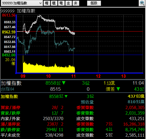 台北股市今天開盤上漲1.91點、0.02%,報8564.50點,成交金額為12.18億元。未來因國際股市壓力、外資轉賣、國安基金今將討論是否退場,分析師認為,除非股市量能放大上攻,否則短線將在8600點上下整理。