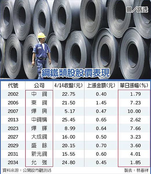 受到鋼鐵原物料價格和大陸鋼胚、成品價格上漲等因素激勵,昨日在中鋼(2002)帶頭漲下,包括東鋼(2006)、燁興(2007)、中鋼構(2013)、豐興(2015)、燁輝(2023)、大成鋼(2027)、盛餘(2029)、彰源(2030)、新光鋼(2031)、新鋼(2032)、允強(2034)、運錩(2069)及F-東明(5538)等股,都呈現上揚局面;尤其不銹鋼上市個股全面走揚,其中燁興一舉攻上漲停板,每股上漲0.47元,表現最為亮眼。