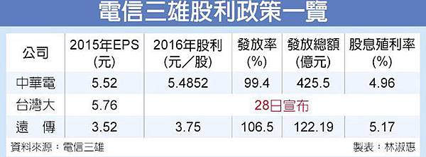 【電信三雄賺飽飽股息看7百億】 電信三雄將於本周四(28日)同一天舉辦法說會,預期市場將關注三大議題:一、千元以下吃到飽全面退場的時間表,二、中華電(2412)董事提名名單,三、以及台灣大的股利政策。  電信三雄去年賺飽飽,今年的股利政策普遍很大方,預估股利總額將落在690~700億元。 中華電信今年將舉行董監改選, 26日公布董事及獨立董事提名名單,其中,現任五席獨董只有一席留任,到時候,市場反應也會是參考指標。