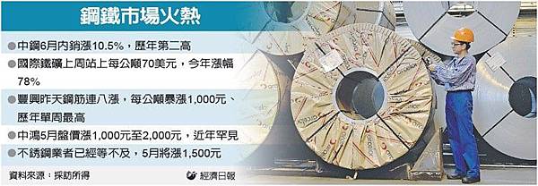 【鋼價全上揚漲勢還沒完??】 鋼鐵市場愈來愈旺,鋼筋、碳鋼與不銹鋼三大類產品全面上漲;5月不銹鋼每公噸最少調高1,500元,市場分析「漲勢還沒停止,後續還要再漲」。 這波鋼價大漲,從原料端的鐵礦、廢鋼以及碳鋼、不銹鋼,鋼筋等,工業以及建築用鋼全部漲齊,而產業層面也受惠頗多,小到螺絲、大到工具機、鋼構工程、造船全面都受到加持,換言之,將可因鋼價上漲對外調高報價。 台灣與國際行情比,廢鋼與鋼筋價格還跟不上,鋼價走揚只是趕進度,貼近海外報價,並非台灣漲得特別高。