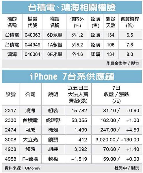 經濟日報 記者魏興中/台北報導 因應蘋果iPhone 7下半年面市,法人圈傳出部分供應鏈已接到拉貨指令,激勵近期蘋果以及供應鏈股價轉趨強勢。台系相關概念股,包括台積電(2330)、鴻海、和碩、大立光、可成等,成為帶動昨(7)日台股走揚創反彈新高的中流砥柱。 法人圈指出,iPhone 7最大亮點有三:更為先進的A10處理器,效能高、成本低、體積小;儲存容量顯著提升,最高容量達256GB,創歷年來iPhone NAND Flash容量新高;5.5吋機種搭載雙鏡頭。 以台積電全拿iPhone 7的A10處理器為例,里昂證券半導體產業分析師侯明孝指出,與前代處理器相比,A10的效能高出20%至25%,成本低10%至15%,體積也縮小了10%至15%。由於台積電製程持續領先,未來也將囊括全數A11訂單。 而5月營收已攀上今年以來單月高峰的大立光,由於受惠鏡頭升級趨勢、以及iPhone 7採雙鏡頭設計並開始啟動拉貨潮,配合非蘋陣營新機齊發,內外資法人也紛紛看好大立光後續的營運走勢,引動近來三大法人積極追捧,拉動股價強勢。