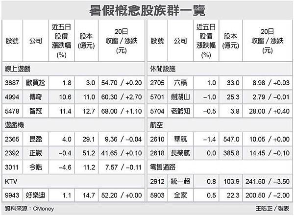 觀察現階段上市櫃公司屬於「暑假概念」的個股,計有線上遊戲軟體,如傳奇(4994)、智冠、歐買尬;遊戲機概念族群,如昆盈、正崴、今皓等;還有休閒設施的六福、劍湖山、老爺知;航空業中的華航、長榮航;夏季冰品及零售通路的統一超、全家;還有KTV好樂迪等相關產業。 進一步觀察近五日的股價表現,線上遊戲、休閒設施等族群即已率先反應暑假來臨的旺季效應,傳奇、智冠、老爺知、歐買尬、六福等,股價均穩步向上攀升。 黃文清表示,由於暑假長達兩個月,許多年輕消費族群或學生,將會選擇打遊戲機來消磨時間,遊戲機的機組及其相關零組件需求應會大增,搭配遊戲機的遊戲軟體個股也可望受惠。