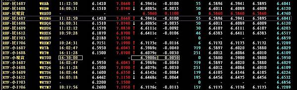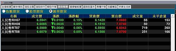 美元兌人民幣匯率期貨 英文代碼RHF 交易時間:上午8:45~下午4:15 契約規模:100,000美元 交割月份:連續2個月份,另加上3、6、9、12月中4個接續季月,總共6個月份的契約在市場交易 每日結算價:採當日收盤前1分鐘內所有交易之成交量加權平均價 每日最大漲跌幅限制:為前一交易日結算價上下7% 報價方式:每1美元兌人民幣 最小跳動點單位:人民幣0.0001元/美元(人民幣10元) 圖截自康和全都賺