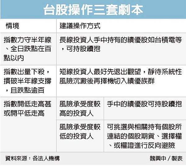 首先,若台股今天力守半年線、全日跌點在百點以內,長線投資人手中持有的績優股如台積電等,暫時不必急著殺出。第二種是,若指數出量下殺,摜破半年線支撐,且跌點逾百,則建議短線投資人最好先退出觀望,靜待系統性風險沉澱後,再擇機切入績優族群。