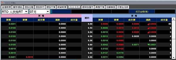 ●美元兌人民幣匯率選擇權契約規格● 交易標的:美元兌人民幣匯率 到期月份:自交易當月起連續2個月份,另加上3、6、9、12月中4個接續季月,總共有6個月份的契約在市場交易 權利金報價單位 :0.0001點(人民幣10元) 每日漲跌幅:權利金每日最大漲跌點數,以前一營業日同月份小型美元兌人民幣匯率期貨契約結算價之7%為限 交易時間:上午8:45~下午4:15 到期月份契約最後交易日之交易時間:上午8:45~上午11:00 最後交易日:各月份契約的最後交易日為各該契約到期月份第三個星期三 最後結算價:香港財資市場公會在最後交易日上午11:15公布之美元兌人民幣(香港)即期匯率定盤價