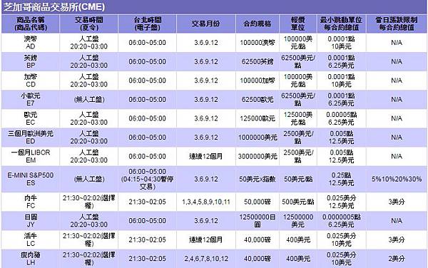 芝加哥商品交易所CME合約規格/交易時間/一點多少/漲跌幅限制 芝加哥商品交易所CME商品保證金 交易所名稱....... 商品名稱.................代號..........原始保證金......維持保證金...幣別