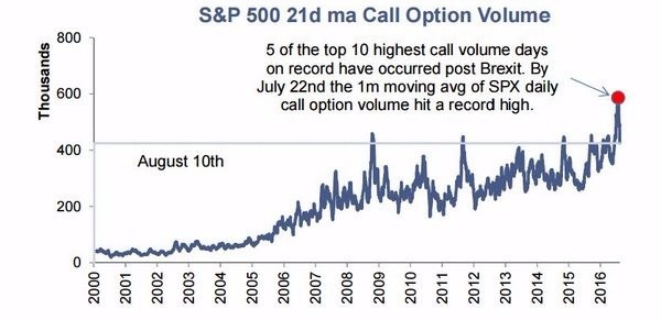 對於市場上如此瘋狂的看漲情緒,美商高盛證券 (Goldman Sachs) 在一份研究報告中指出,從 S&P500 買權截至 7 月 22 為止的一個月平均成交量來看,買權成交量已經是刷新了歷史新高水準,顯示在美股短線急漲的趨勢之下,許多投資人寧可選擇搶進買權,也不願意進入股市實質地擁有股票。